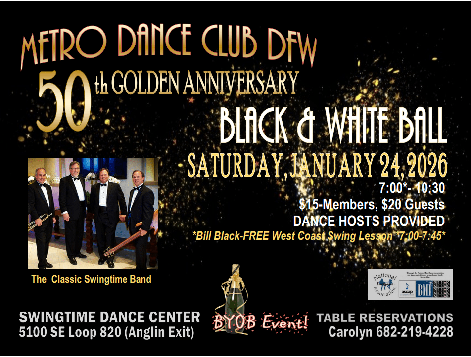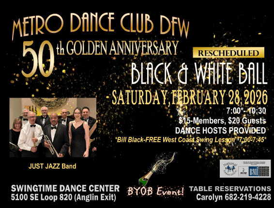 RESCHEDULED // Our Black & White Ball will be held February 28th since we had to hibernate due to ice/sleet/snow the end of January. Please come celebrate our 50th Golden Anniversary with us on February 28th at Swingtime Center, 5100 SW Loop 820, Fort Worth (Forest Hill), TX, Anglin Exit. FREE West Coast Swing dance lesson by Bill Black starts at 7pm to 7:45pm. JUST JAZZ BAND will play for our dancing, with recorded music by Debbie B on their breaks. We will have a variety of dance tunes, several fun mixers or waterfalls, several dance hosts, and some special surprises. This is a BYOB event, with water & sodas for sale. Though many will dress in formal black and white tux/suit attire, it is NOT required. Guys can wear slacks and buttoned collared shirt. No jacket or tie is mandatory. We want everyone to be comfortable and enjoy the evening of music, dancing, and catching up with friends. LADIES – formal long gowns, short dresses, or dressy casual is fine. Please bring a warm shawl/sweater, too. If you have questions, or want to make reservations, call or text Carolyn Hussey 682-219-4228.