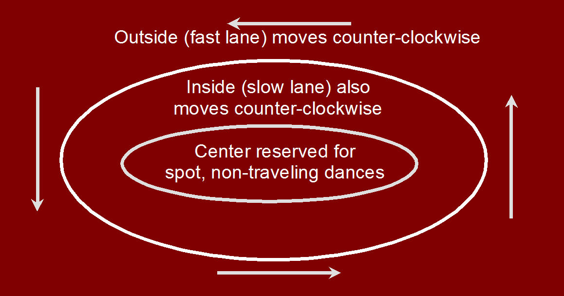 Fox Trots, Waltzes, Tangos, Polkas or Two-Steps are always danced counter-clockwise (Line of Dance). This allows dancers to circle the floor in a systematic fashion. Outside lanes are used by faster dancers, inner lanes by slower dancers, and the center of the floor, as noted above, is reserved for dances that do not travel.